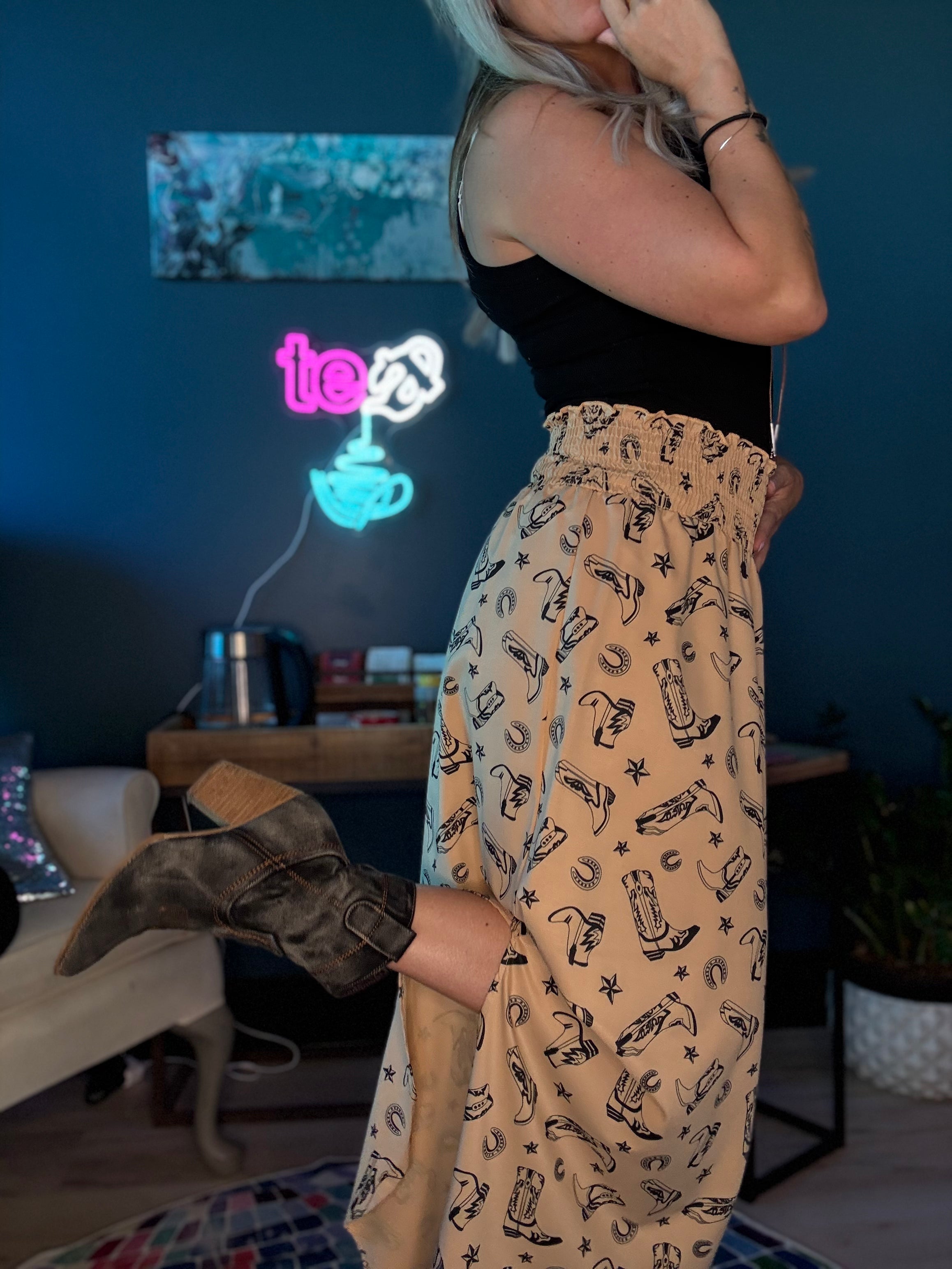Celebrate your cowgirl spirit with our Western Boot Prints Smock Waist Woven Skirt, a playful nod to the rodeo life. Featuring an all-over print of classic Western boots, this skirt is equal parts fun and fashionable, making it a standout piece for country concerts, festivals, and casual weekend outings. The flowy woven fabric keeps it light and breezy, perfect for dancing the night away or strolling through town.